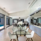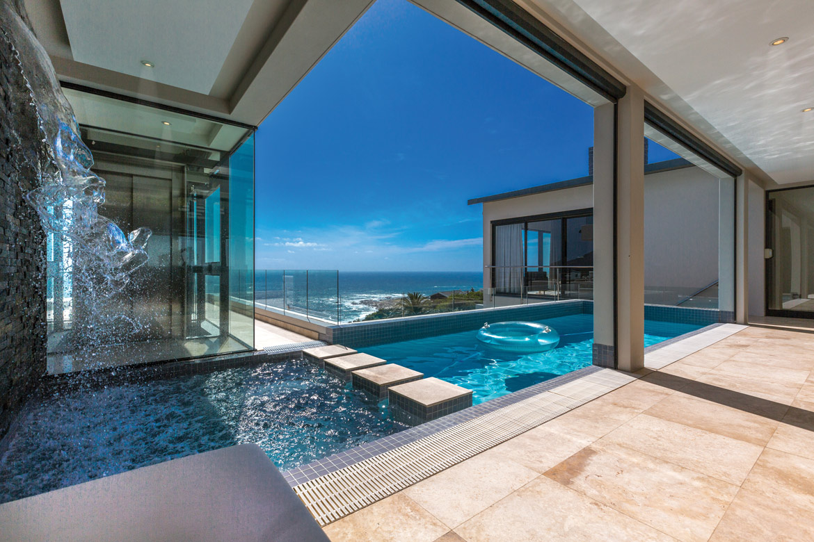 Set against the vista of the majestic Twelve Apostles and surrounded by the natural beauty of the Atlantic Seaboard, a jewel designed by renowned architect Gert Weideman showcases panoramic views of Cape Town’s western coastline. From the roof terrace, where every sunset is destined to become a memory, to the exquisite wine tasting room that is as tasteful as the vintages it houses, the fully automated, five-bedroom smart home embodies unmatched style, comfort, and distinction. An elegant open floor plan flows organically from the bedroom suites to the outdoor saltwater pool, Jacuzzi, and covered grill area. A sleek elevator serves all three floors.