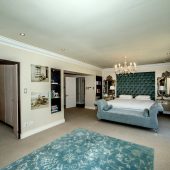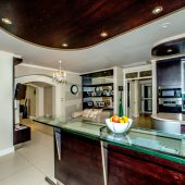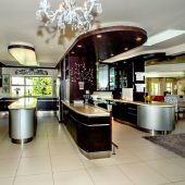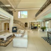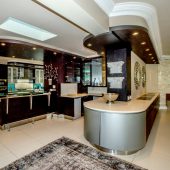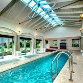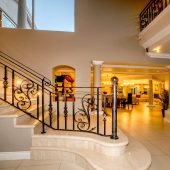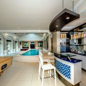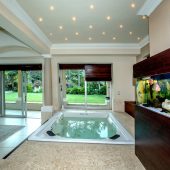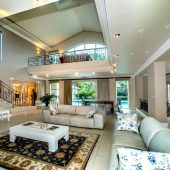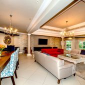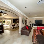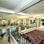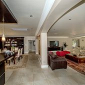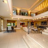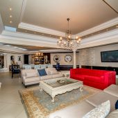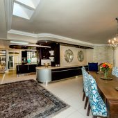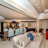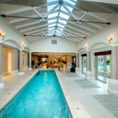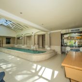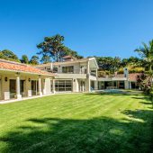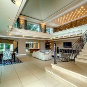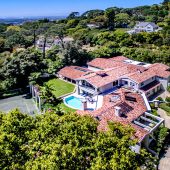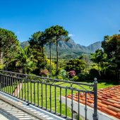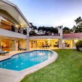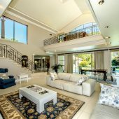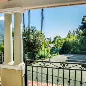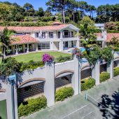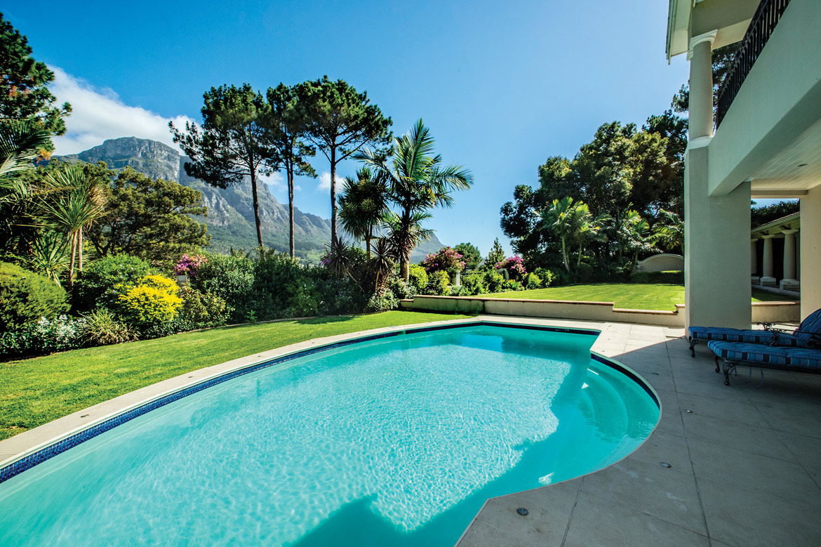 Ideally placed in exclusive Bishopscourt, the recently minted estate epitomizes an entertainer’s dream with its luxurious open-plan living areas boasting numerous wet bars, gas fireplaces, and built-in barbecue facilities. Reception rooms seamlessly interweave with the outside living spaces, as double-volume windows and glass doors open onto terraces that embrace superb unobstructed views of the estate’s manicured garden and iconic Table Mountain. An indoor heated pool and Jacuzzi, a subterranean squash court, floodlit tennis court, and outdoor salt-water swimming pool provide guests numerous recreational options. Additional features are two separate guest suites, four garage bays, staff accommodations, and a sophisticated security system.
