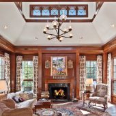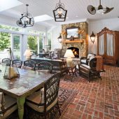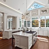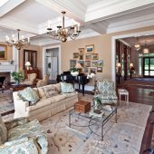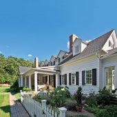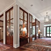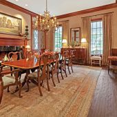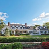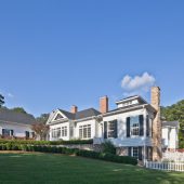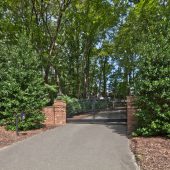 Reminiscent of a Connecticut country house, the estate near the University of North Carolina’s Chapel Hill campus welcomes you to over three acres of heartwarming charm. The generous haven bestows some 11,500 square feet of French-doored settings enjoying over three gently sloping acres of enchanting gardens. A soaring center hall introduces the light-infused living room with coffered ceiling and twin fireplaces. The dramatic dining room features 250-year-old paneled doors from England. Carrara marble adorns the kitchen. The soaring library glows with pine bookcases. A transverse hall reveals the firelit master suite and one of two offices. At treetop-level three view-filled bedrooms lend romance.