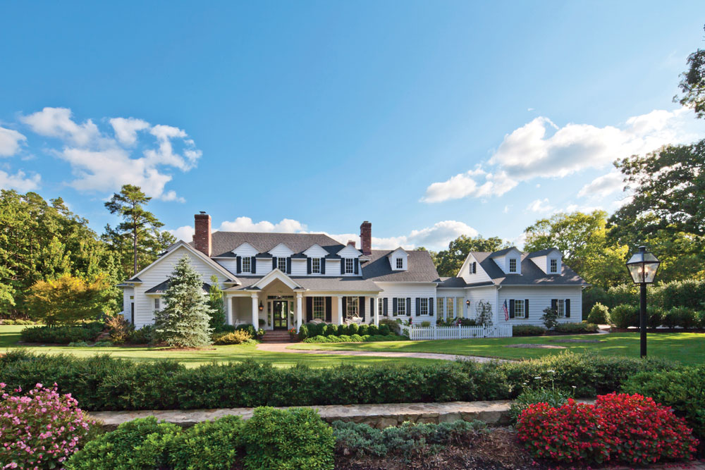 Reminiscent of a Connecticut country house, the estate near the University of North Carolina’s Chapel Hill campus welcomes you to over three acres of heartwarming charm. The generous haven bestows some 11,500 square feet of French-doored settings enjoying over three gently sloping acres of enchanting gardens. A soaring center hall introduces the light-infused living room with coffered ceiling and twin fireplaces. The dramatic dining room features 250-year-old paneled doors from England. Carrara marble adorns the kitchen. The soaring library glows with pine bookcases. A transverse hall reveals the firelit master suite and one of two offices. At treetop-level three view-filled bedrooms lend romance.