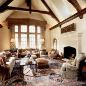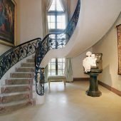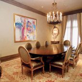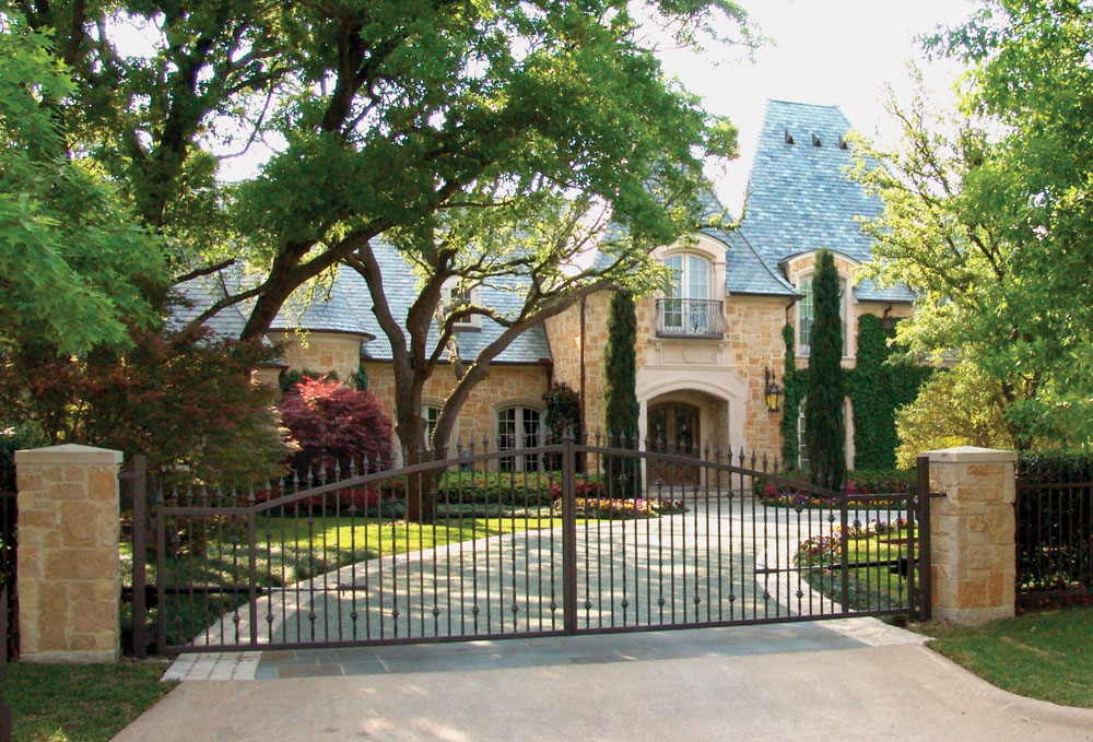 Scaled for hospitality Texas style, and endowed with elements of the French countryside, the residence exudes both warmth and sophistication. Limestone-floored galleries and a foyer with dramatic iron staircase introduce exquisite formal settings set off by arches and Venetian plaster walls. A delicate fleur-de-lis motif adorns the kitchen cabinetry. Other favorite settings are a family room with stone fireplace and wine room, a mahogany library, a media room, and four beautiful private bedrooms. From the stately gates to the poolside gardens, the Dallas estate is a tribute to Texas architecture.