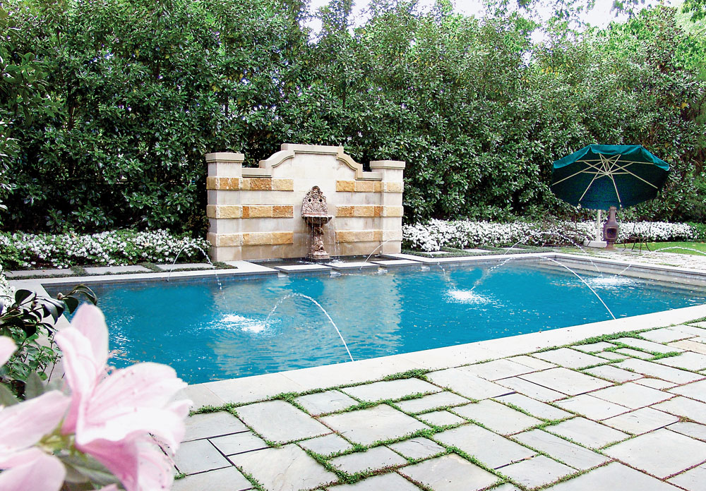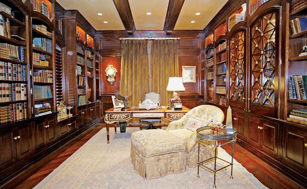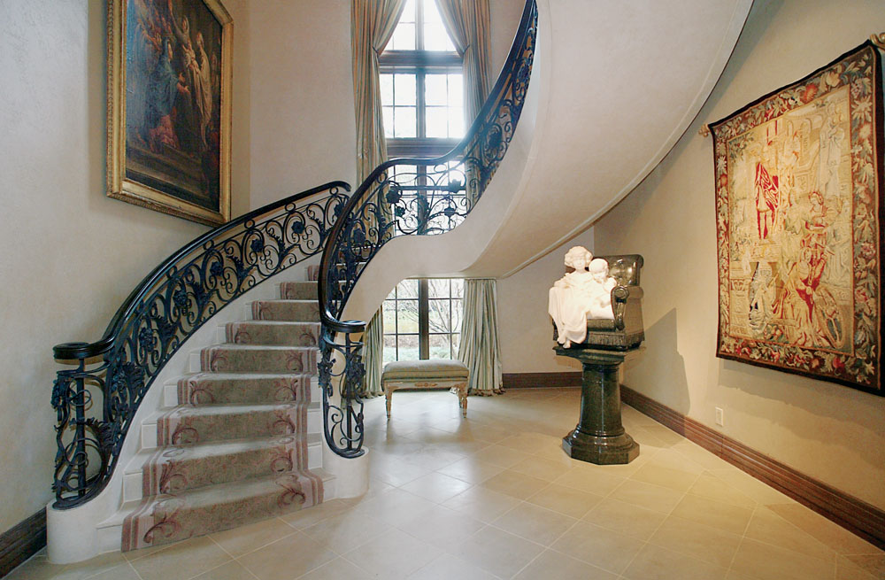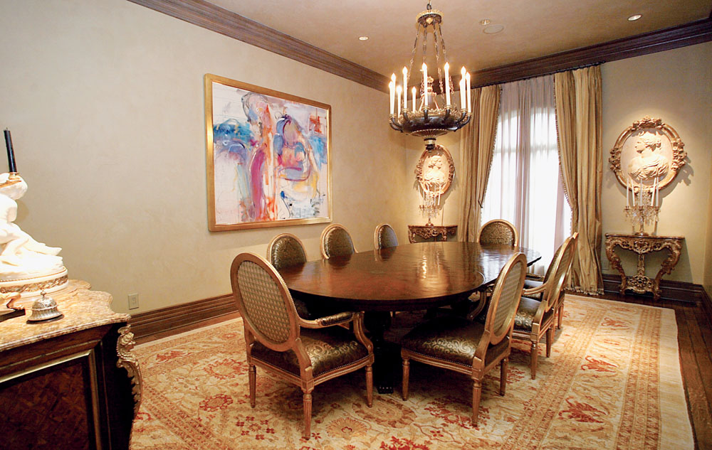Scaled for hospitality Texas style, and endowed with elements of the French countryside, the residence exudes both warmth and sophistication. Limestone-floored galleries and a foyer with dramatic iron staircase introduce exquisite formal settings set off by arches and Venetian plaster walls. A delicate fleur-de-lis motif adorns the kitchen cabinetry. Other favorite settings are a family room with stone fireplace and wine room, a mahogany library, a media room, and four beautiful private bedrooms. From the stately gates to the poolside gardens, the Dallas estate is a tribute to Texas architecture.